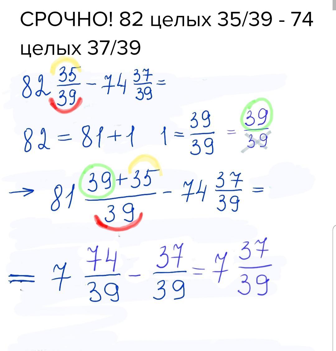 82 35/39- 74 37/39=81 39+35/39-74 37/39= 81 74/39- 74 37/39=7 37/39