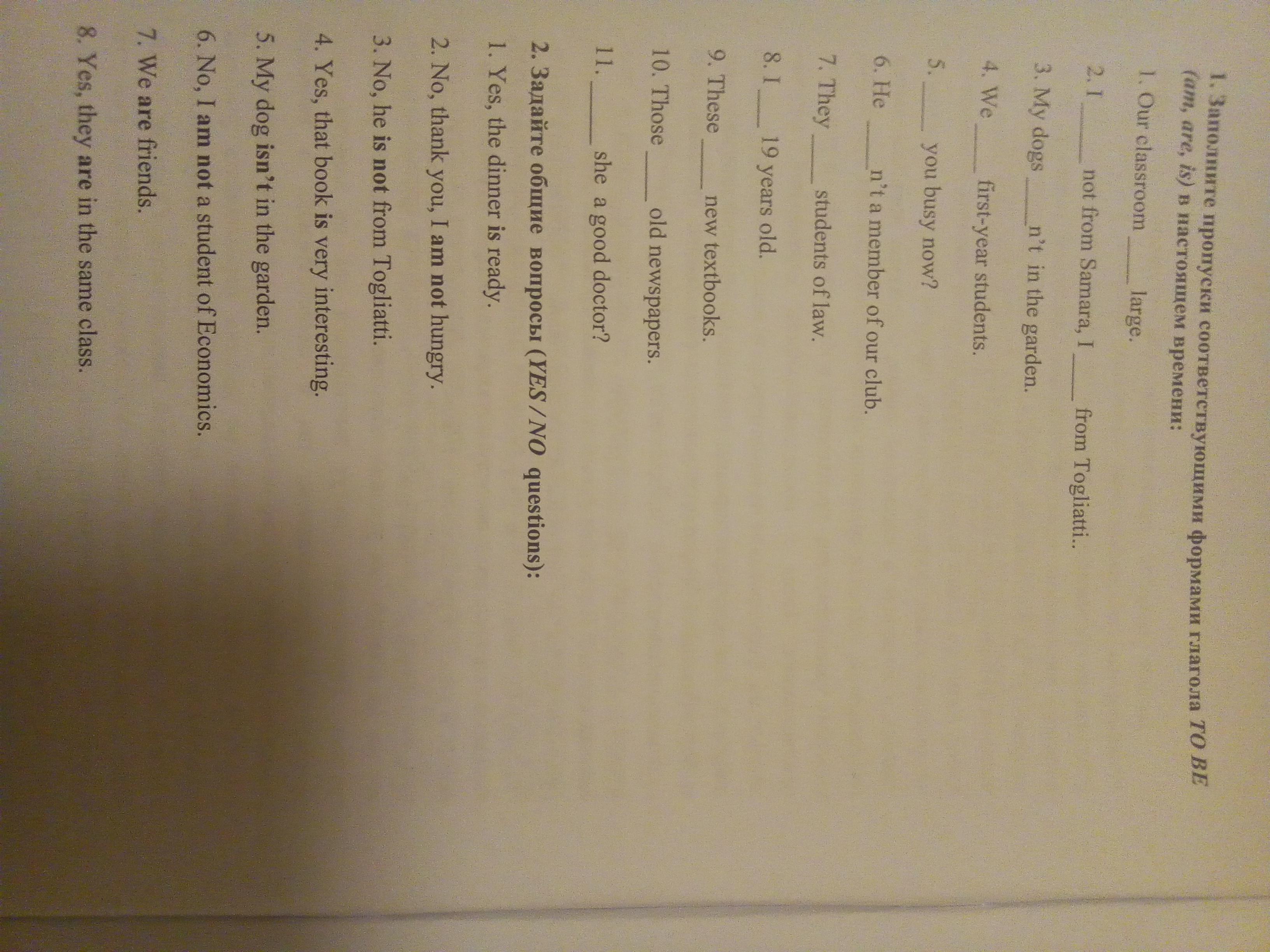 2) 1. Is the dinner ready? 2. Are you hungry? 3. Is he from Togliatti? 4. Is that book very interesting? 5. Is your dog in the garden? 6. Are you a student of economics? 7. Are we friends? 8. Are they in the same class?