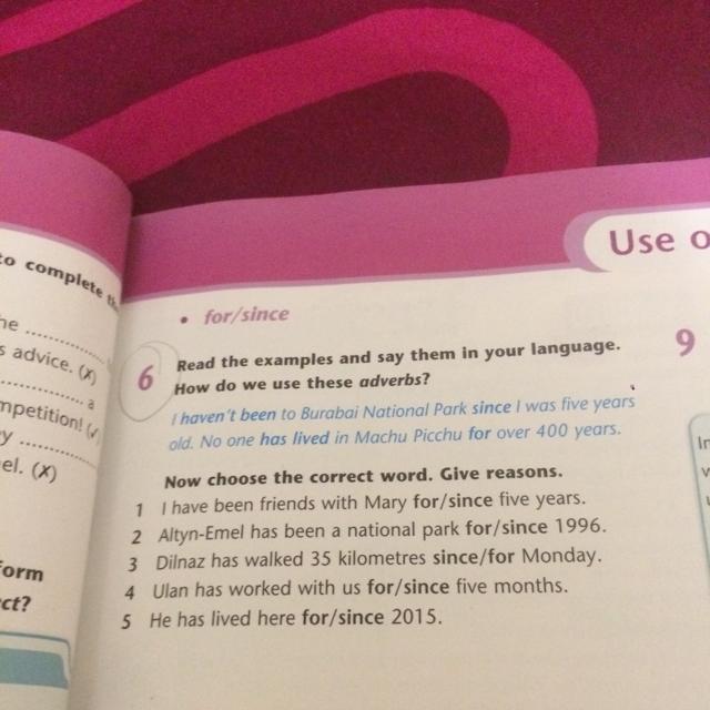 1)I have been friends with Mary for five years. 2)Altyn - Emel has been a national park since 1996. 3)for. 4)for. 5)since