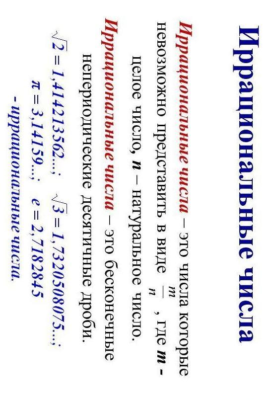 Иррациональные числа каторые каторые не могут быть рациональными числами. Нам известно что П(пи) =3.14 это Иррациональный число. Любое Иррациональное число может быть записано в виде бесконечного непериодического десятичного числа