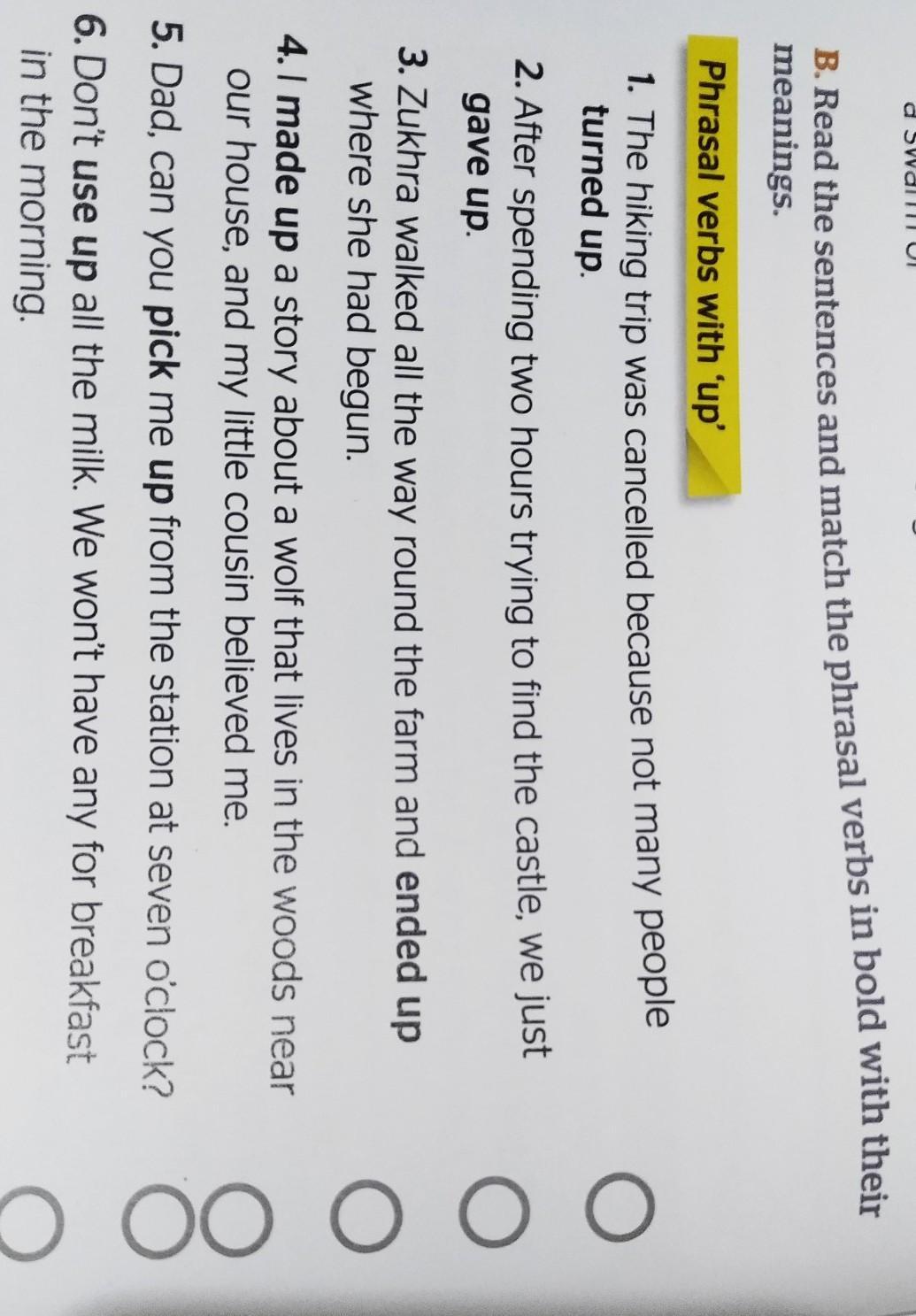 Прочитайте предложения и сопоставьте фразовые глаголы жирным шрифтом с их значениями Фразовые глаголы с «вверх» 1. Поход был отменен, потому что не так много людей пришли. 2. Потратив два часа на поиски замка, мы просто сдались 3. Зухра обошла всю ферму и оказалась там, где начала. 4.1 составил рассказ о волке, который живет в лесу возле нашего дома, и мой маленький двоюродный брат поверил мне 5. Папа, ты можешь забрать меня со станции в семь часов? 6. Не используйте все молоко. Мы не будем завтракать по утрам.