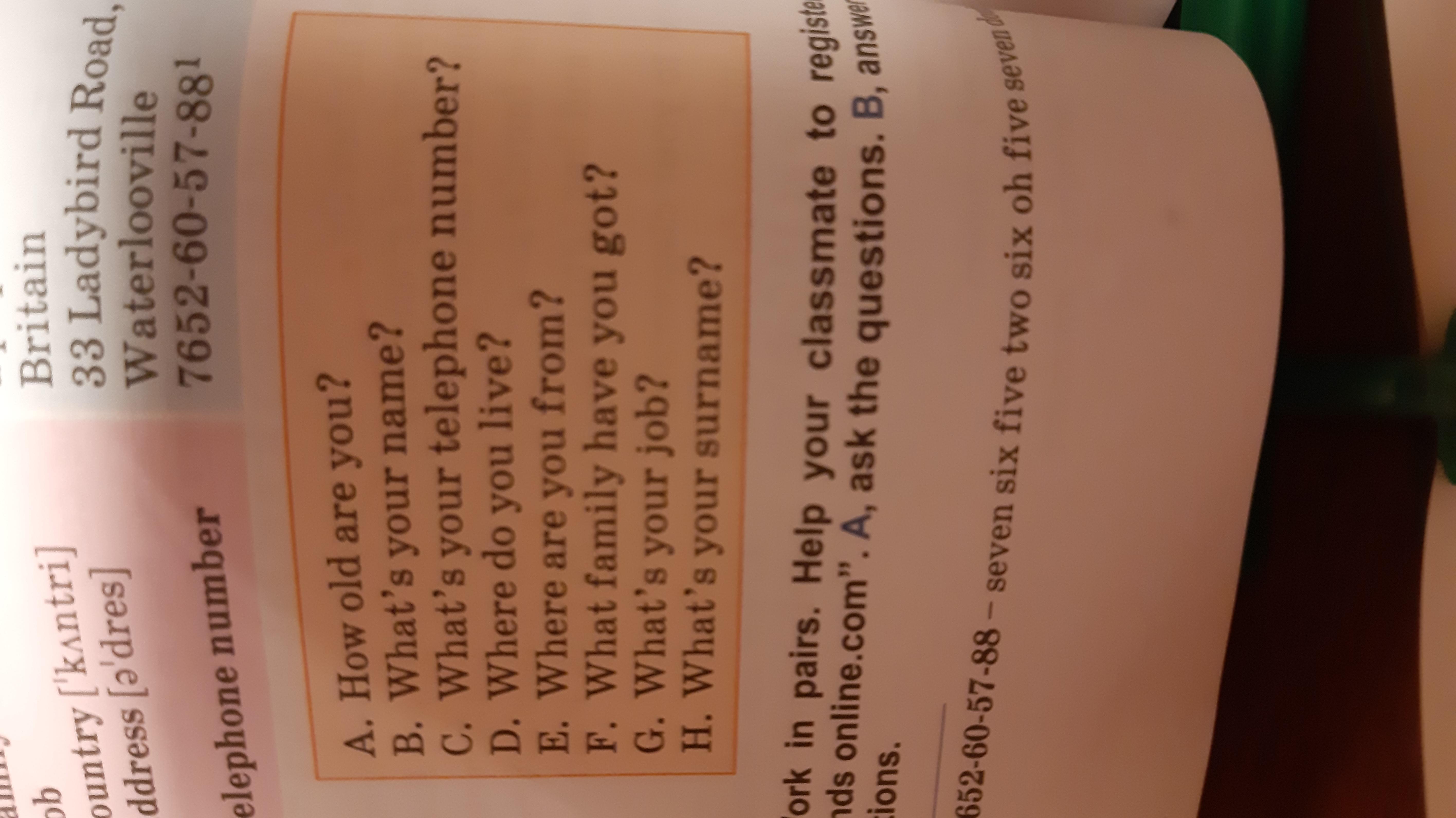 3.Какой у тебя номер телефон?Ответ пишешь какой у тебя номер телефон.Например Му telephone number is 87785726450