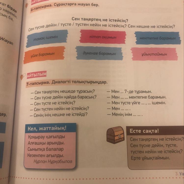 мен түсте үйге келіп, тамақ (түскі ас) ішемін