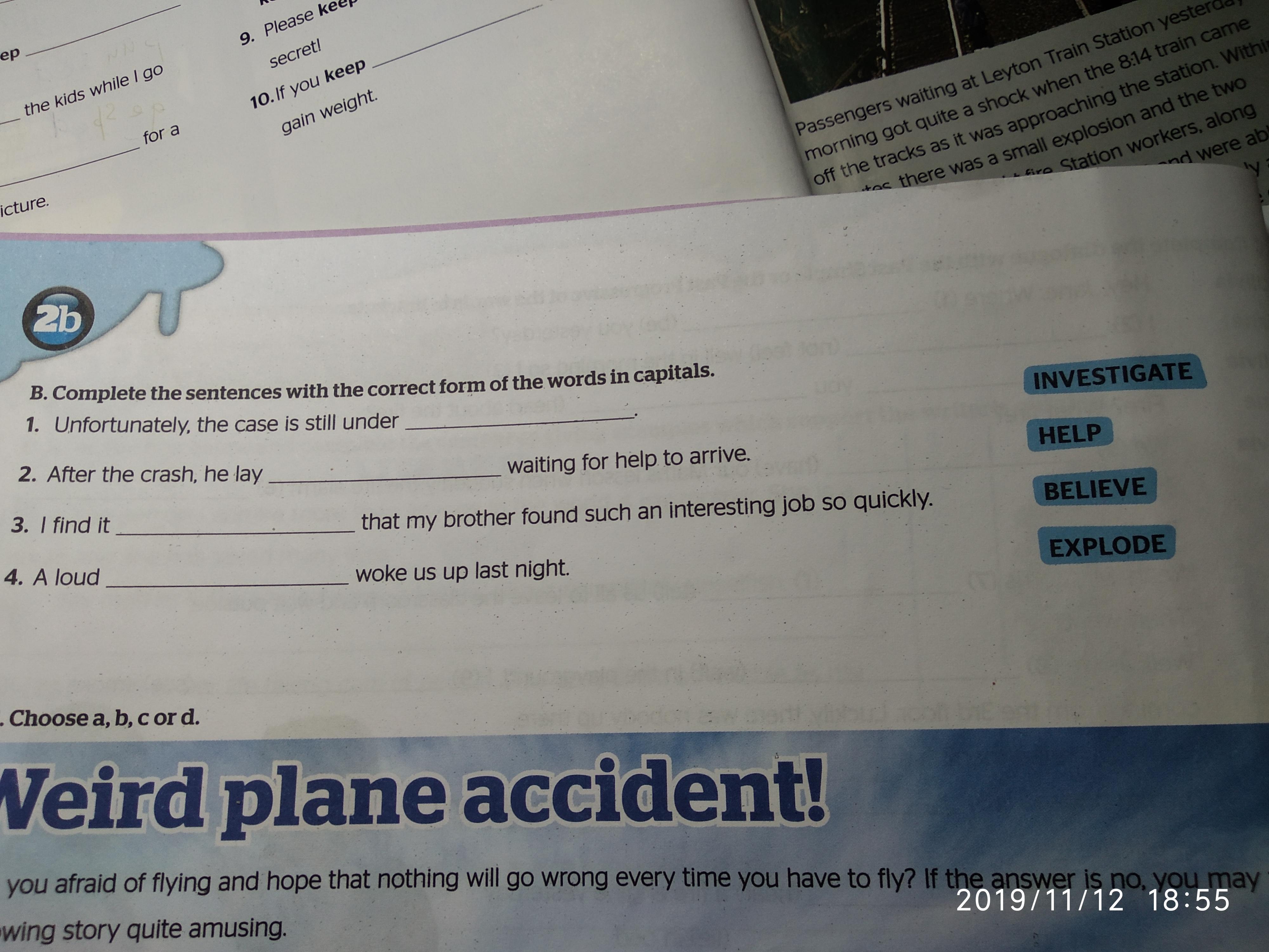 1. investigation; 2. helpless; 3. unbelievable; 4. explosion