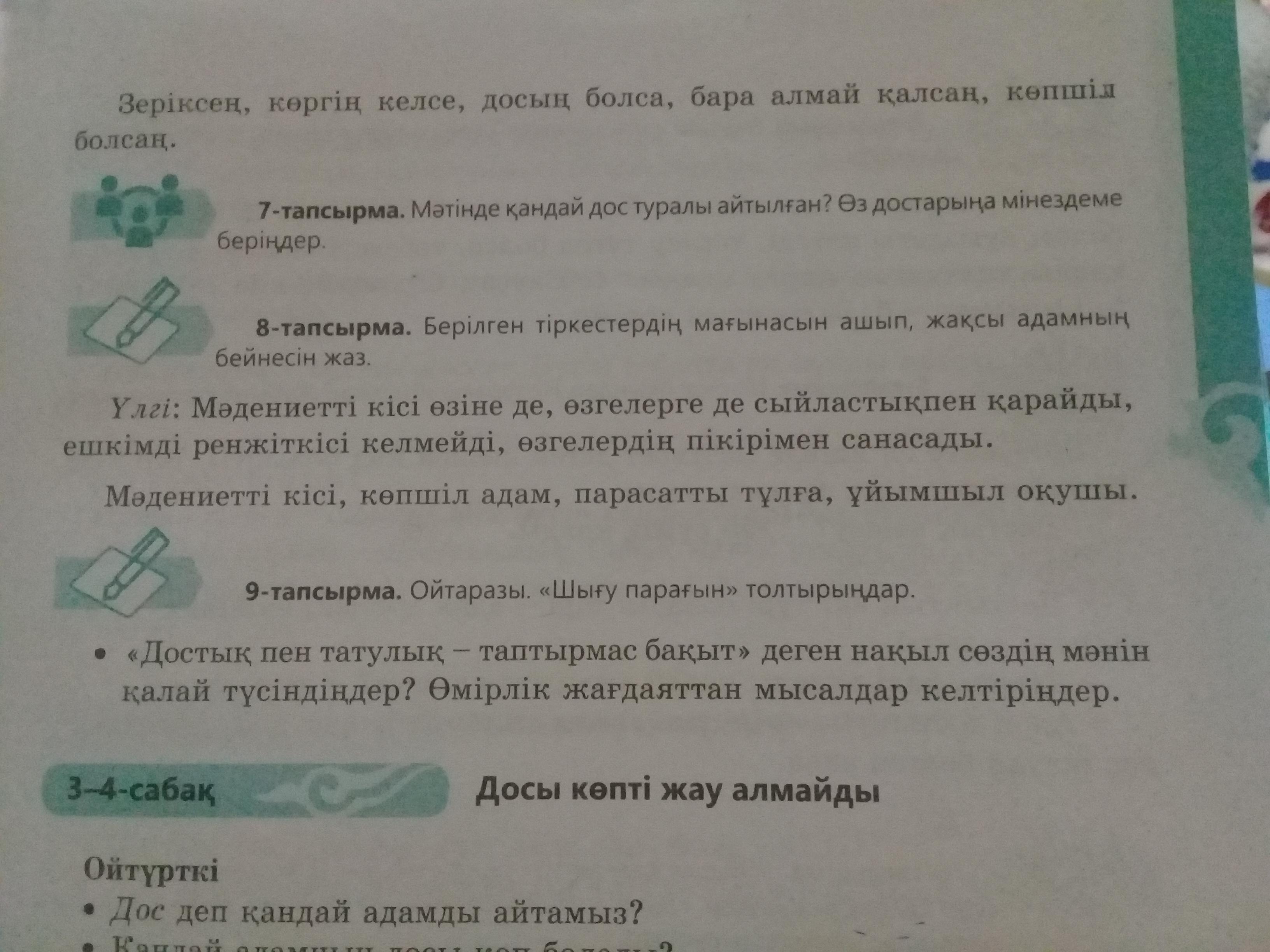 Жаксы адам мадениетти ,парасатты болу керек. Мадениетти адам ар жерде сыпайы,мейримди болады. Копшил адам букулимен сойлесип ,тату- татти карым катынаста болады. Парасатты тулга деп акылды, тусунетин, карапайым адам болып саналады. Уйымшыл окушы деп топта жаксы жумустейтин окушы деп саналады . Осинин барин коссак Жаксы адам мейримди ,уйымшыл,акылды адам