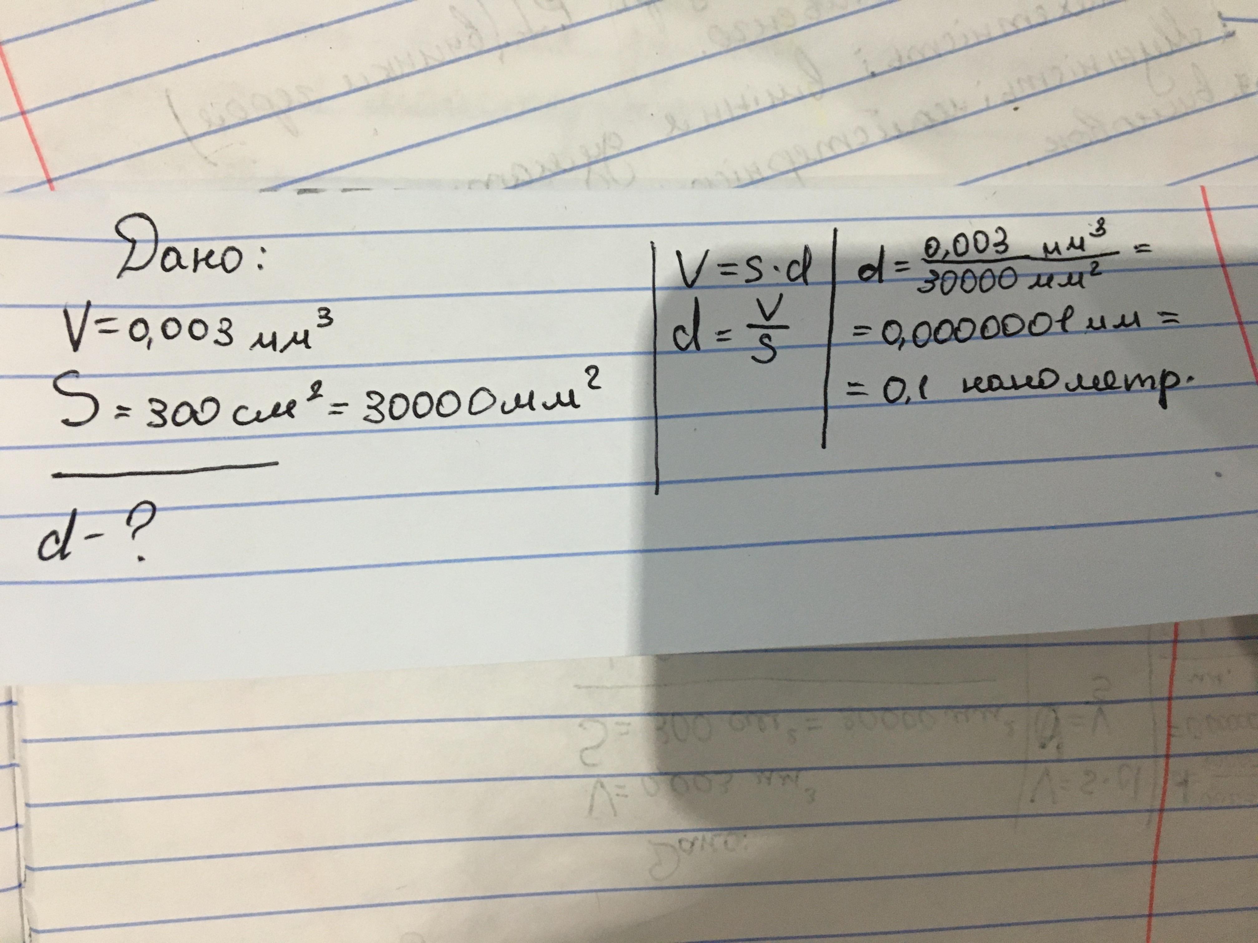 Капля масла объемом 0,003 мм3 растеклась по поверхности воды, получился слой толщиной в одну молекулу, и заняла площадь 300 см2. Определите средний диаметр молекулы масла.