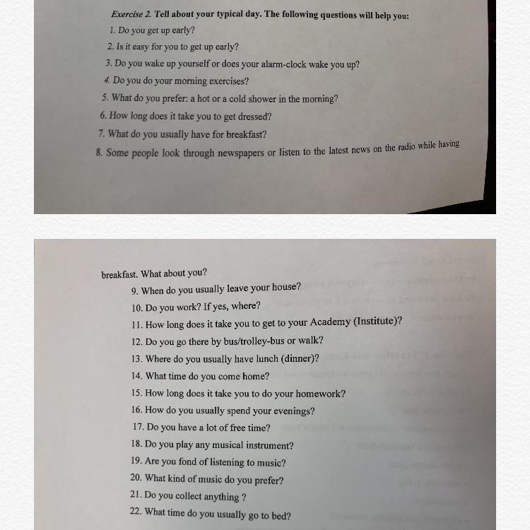 My day starts early at 6:00 o'clock. It's not easy to wake up this early, but I must do it. I wake up myself, but sometimes, when I'm too tired at evening I set up an alarm clock for next day. It helps me to get up. I don't do morning exercises, because I don't have time for it. I prefer cold shower at the morning, because it helps me to wake up completely and straighten up, while warm shower has the exact opposite effect. I get dressed quickly. It is that way because I prepare my clothes from evening and it helps me to choose good option for morning. I usually have porridge with berries for breakfast or salad. Sometimes I prefer sandwich with tea. I listen to the radio news while eating my breakfast, it helps me concentrate. I usually leave my house at 6:50, sometimes at 7:00. I don't work yet. I'm study at (впишите название своего учебного заведения) . It takes me 20 minutes to catch the right bus and and nearly 45 minutes to reach my (впишите название своего учебного заведения). After a long busy day, I come home at 18:00 pm. It takes me 2 hours to do all my homework and prepare for the next day. I love spending my evenings. I'm drinking hot chocolate and watching my favorite films. I don't play any musical instrument, but I love listening to music, especially pop rock and heavy metal. I collects postmarks and mineral stones. Usually I go to bed nearly midnight, after I do all my housework and other stuff.