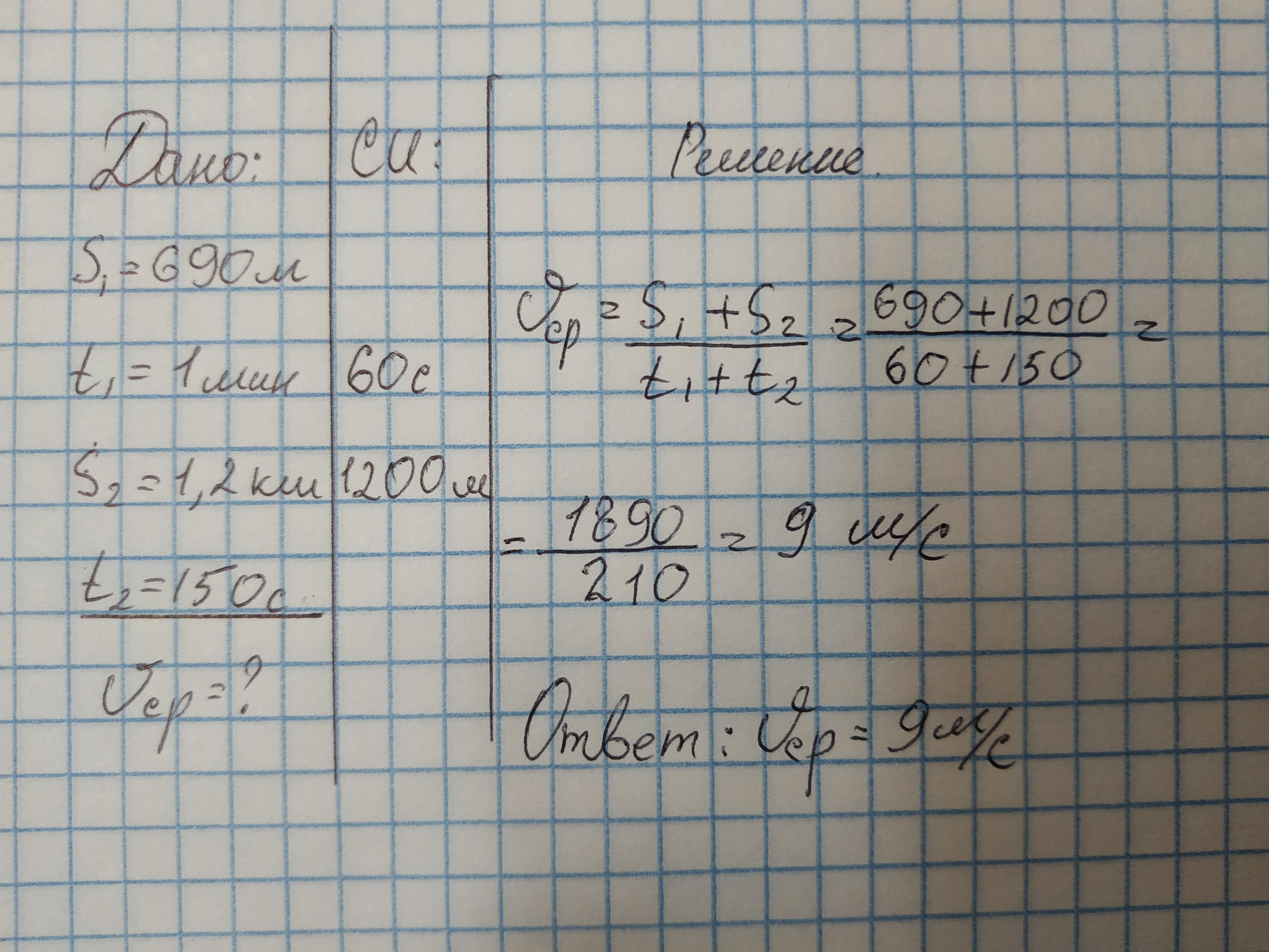 Велосипедист проехал 690 метров в минуту, а затем 1,2 км за 150 секунд. Определите его среднюю скорость на протяжении всего пути