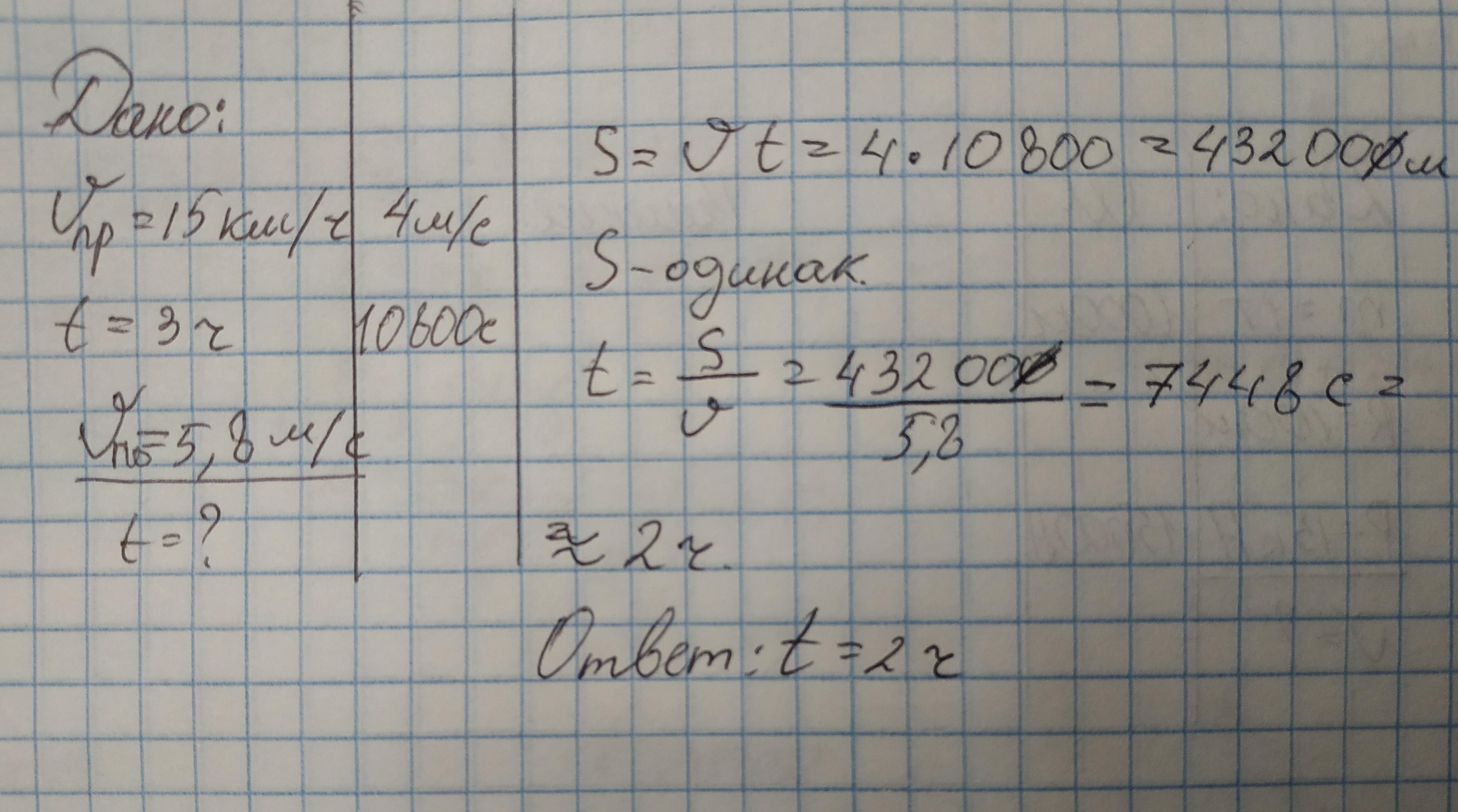 Пароход, двигаясь против течения со скоростью 15 км/ч, проходит расстояние между двумя пристанями за 3 ч. За какое время он пройдёт то же расстояние по течению, если его скорость в этом случае равна 5,8 м/с?