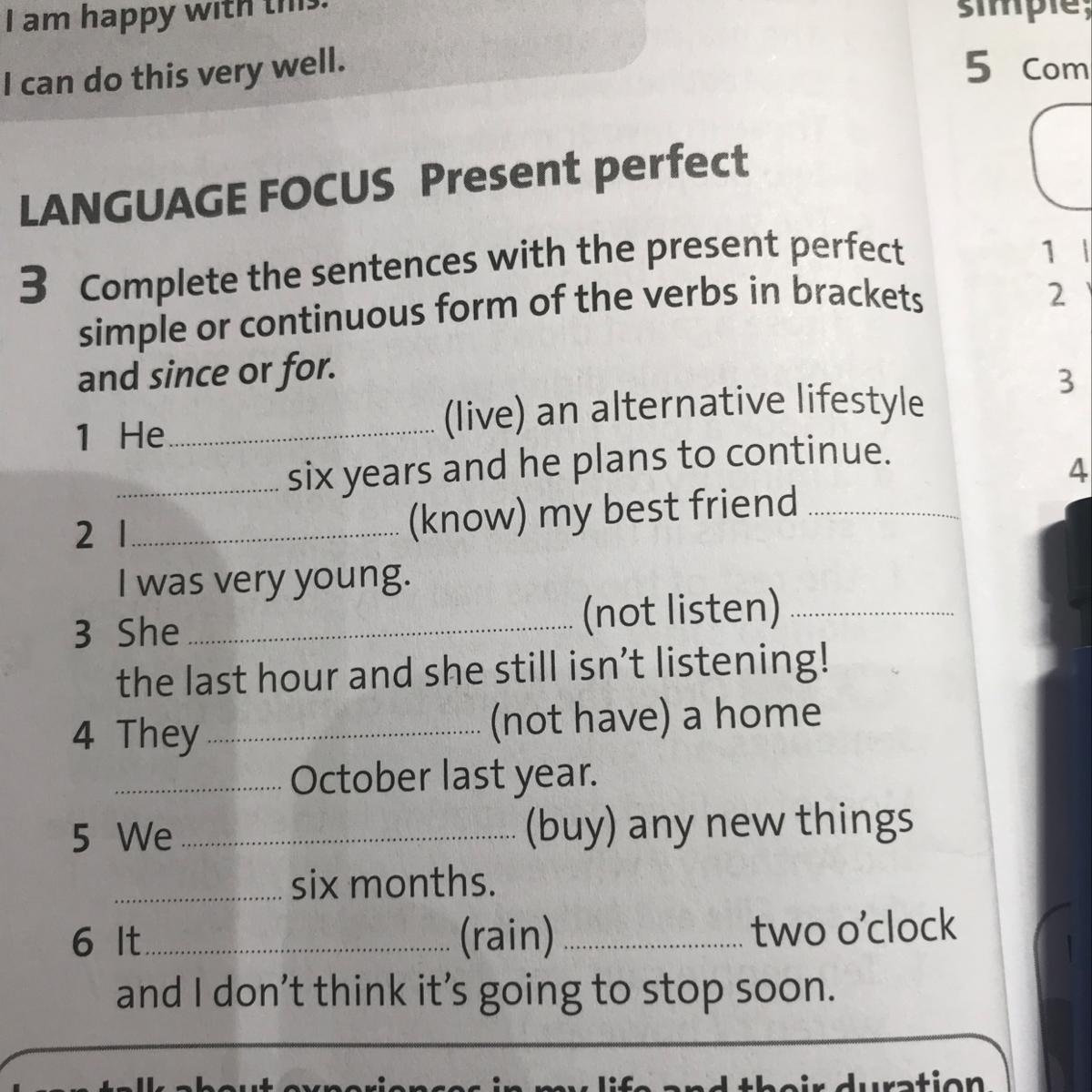 1. He has lived... for six years, 2. I have known .. since.., 3.she hasn’t listened... for.., 4.they haven’t had.. for.., 5.we have bought..for.., 6.it has rained since two o’clock