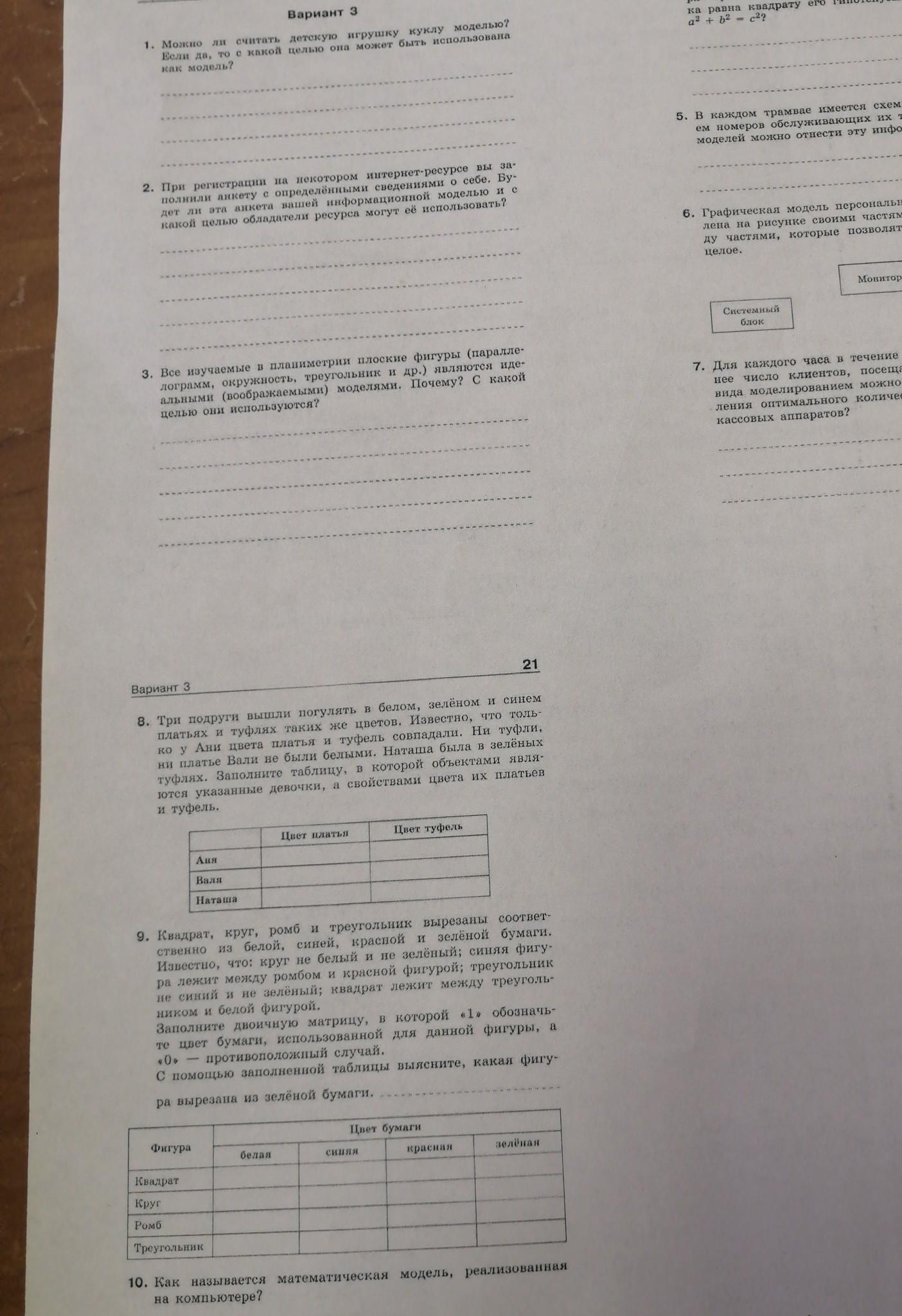 8. у Ани белое платье и белые туфли, у Наташи зеленые туфли и синее платье, у Вали — синие туфли и зеленое платье.