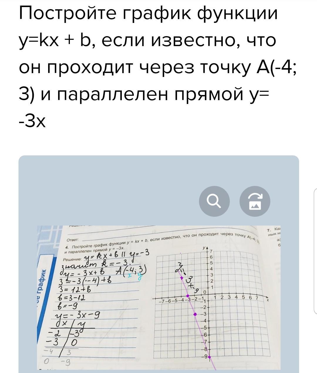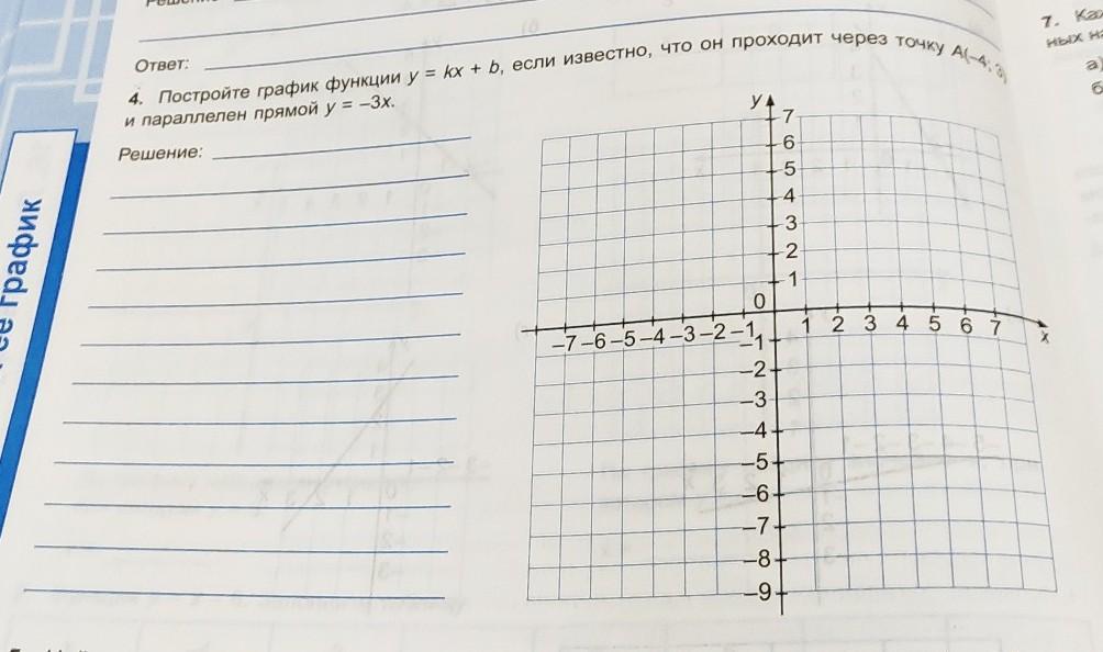 постройте график функции y=kx + b, если известно, что он проходит через точку A(-4; 3) и параллелен прямой y= -3x