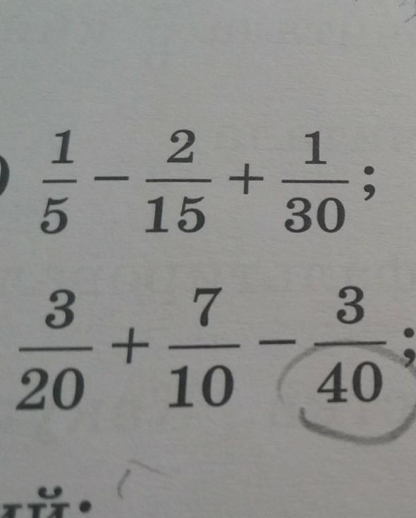 1. 1/5 - 2/15 + 1/30 = (1•6)/(5•6) - (2•2)/(15•2) + 1/30 = 6/30 - 4/30 + 1/30 = 3/30 = (3:3)/(30:3) = 1/10.
