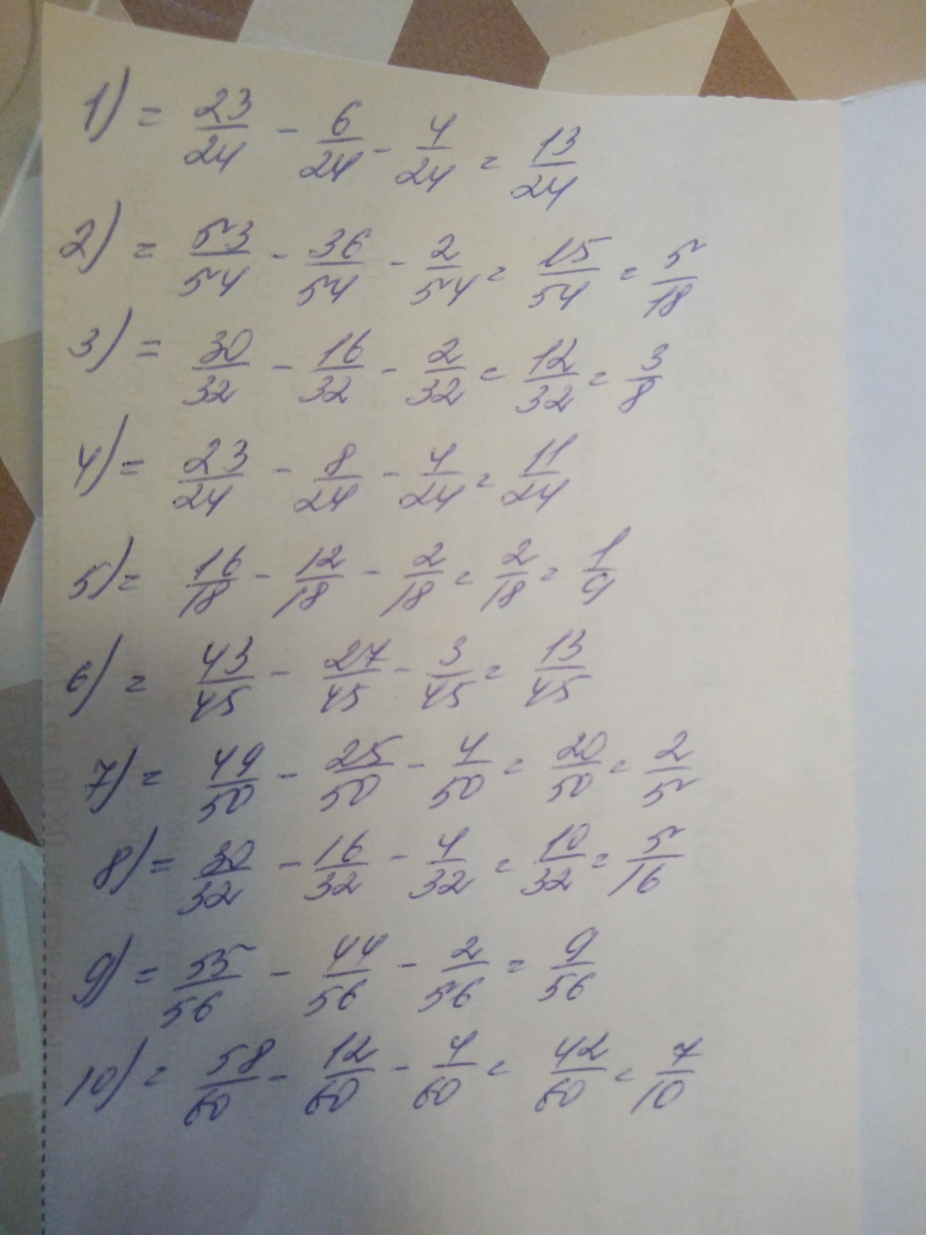 23/24-1/4-2/12. 2) 53/54-4/6-1/27. 3) 30/32-2/4-1/16. 4)23/24-1/3-2/12. 5) 16/18-4/6-1/9. 6) 43/45-3/5-1/15. 7)49/50-5/10-2/25. 8)30/32-2/4-2/16. 9)55/56-11/14-1/28. 10) 58/60-4/20-2/30