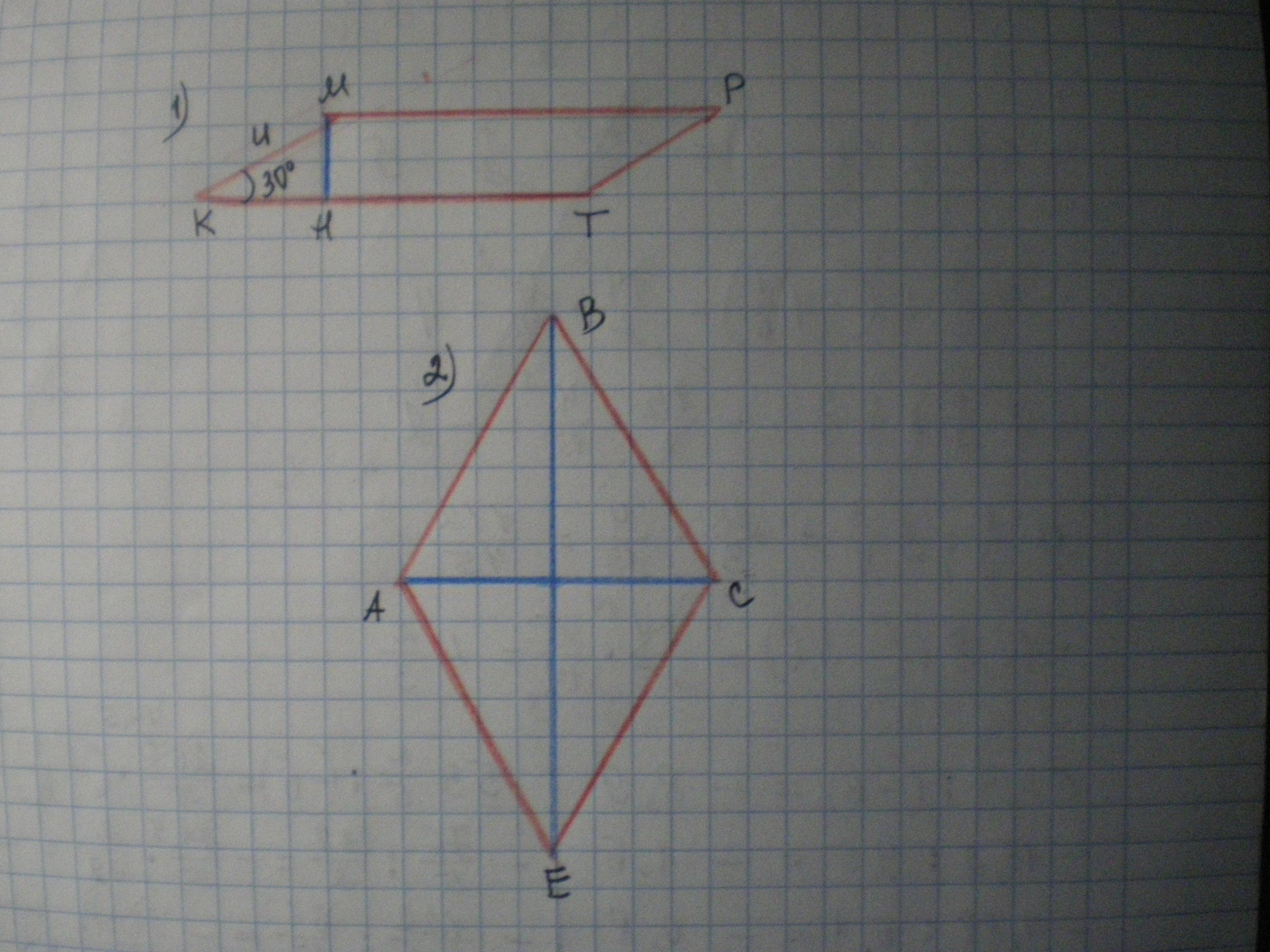 1. Дано: КМРТ - параллелограмм, КТ=10 см, МН - высота, КМ=4 см, ∠К=30°. Найти МН и S(КМРТ).