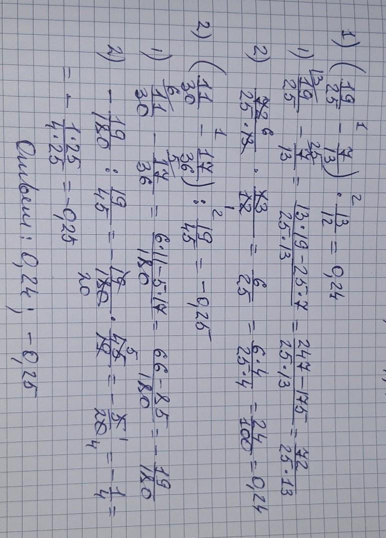 найдите значение выражении 1) (19/25-7/13)×13/12. 2) (11/30-17/36):19/45.