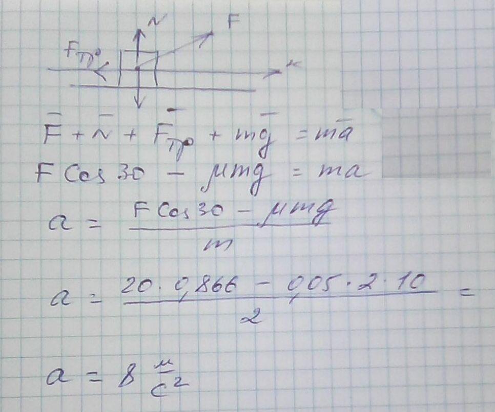 С каким ускорением движется тело массой 2 кг под действием силы 20 Н, направленой под углом 30 градусов к горищонтку, если коэффицент трения иела о поверхность равен 0.05