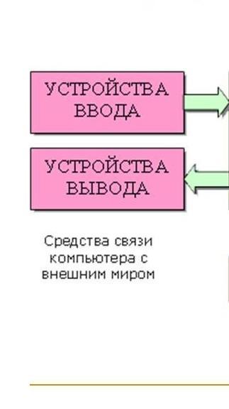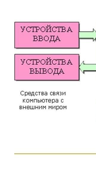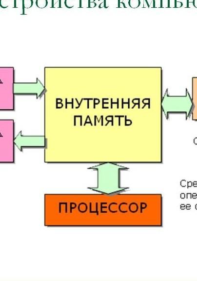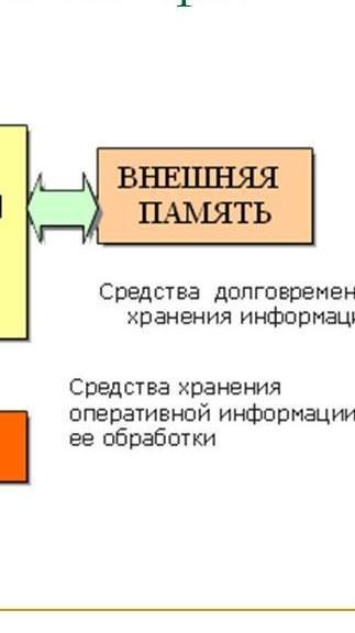 как то вот так вот стрелки идут от внутренней памяти, справа идет стрелка к внешней памяти, а от внешней памяти стрелка идет к внутренней памяти. С левой стороны от устройства ввода стрелка идет к внутренней памяти, от внутренней памяти стрелка идет к устройству вывода. Внизу от процессора стрелка идет в внутреннею память, а от внутренней памяти к процессору.