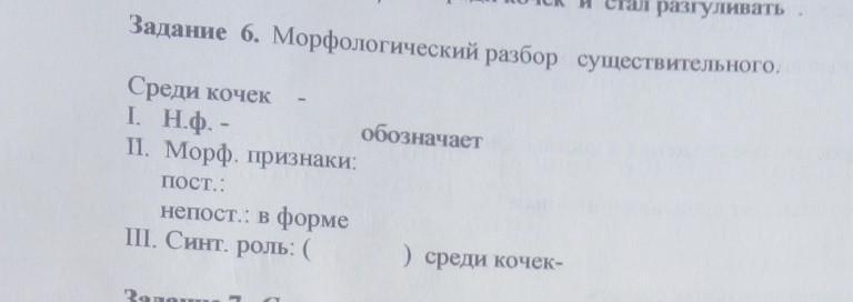 Среди кочек - имя сущ-ное, I.Н.ф. - кочка (что?) обозначает предмет, II.Морф. признаки: пост.: ж.р, 1 скл, неодуш, нариц...непост. в форме ед.ч, Р.п. III.Синт. роль: (где?) среди кочек - обстоятельство.