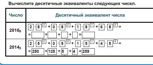 2014₅ = 2·5³ + 0·5² + 1·5¹ + 4·5⁰ = 2·125 + 0·25 + 1·5 + 4·1 = 250 + 5 + 4 = 259₁₀