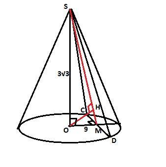 В основі конуса проведено хорду CD на відстані 9см від центра О. СО висота =3 корня из 3 см.