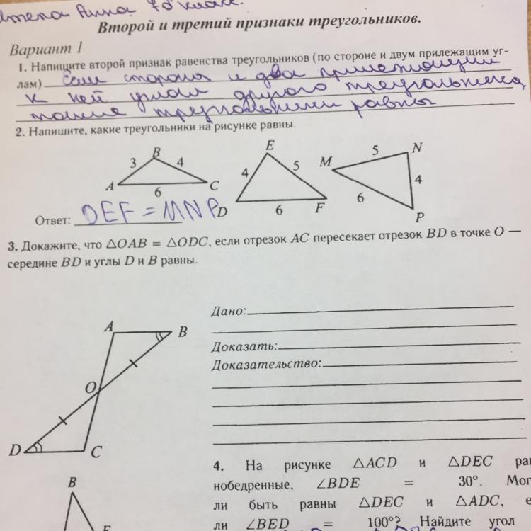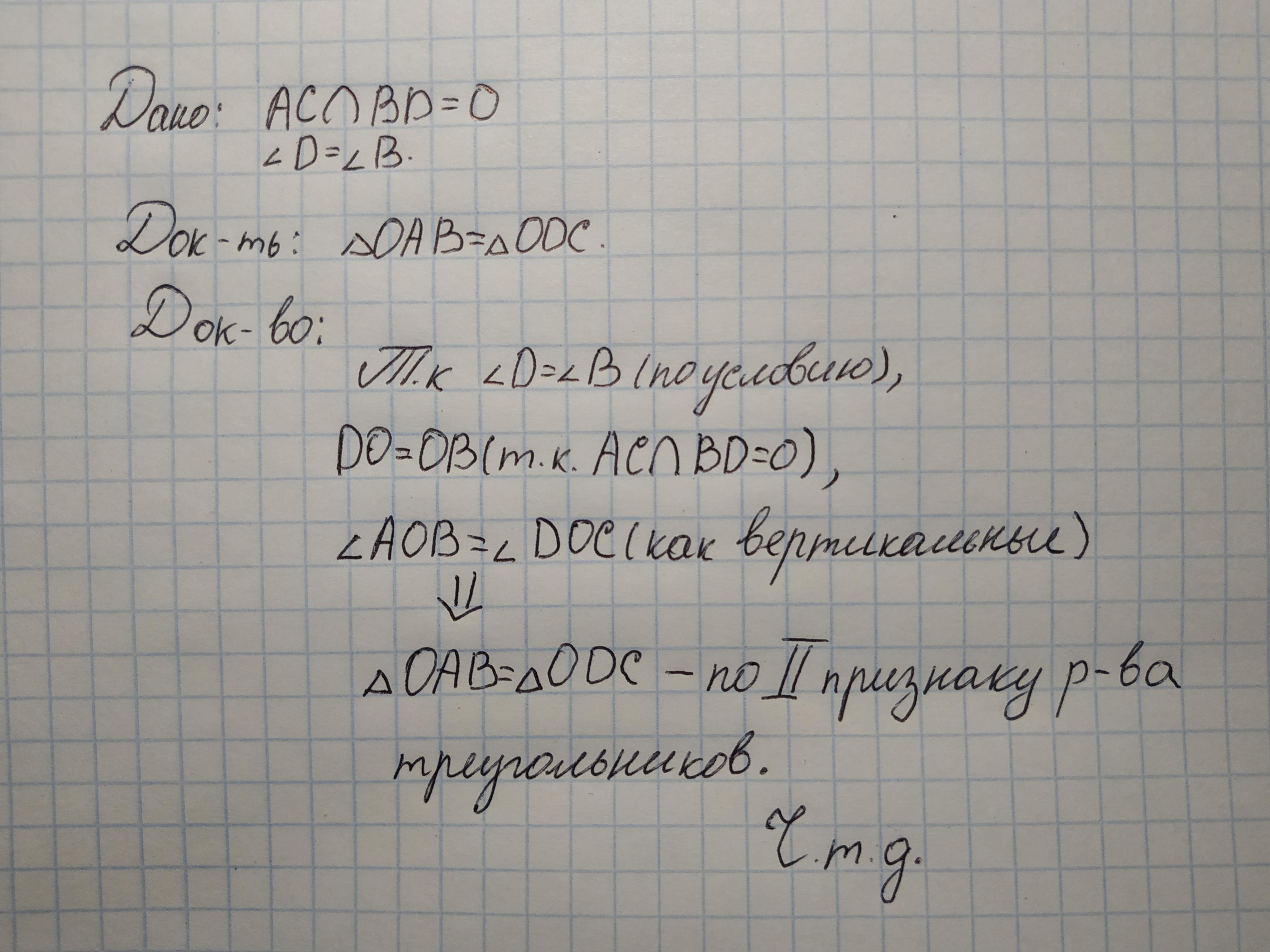 Объяснение:углы АОВ и ДОС равны, т.к. вертикальные. Треугольники равны по 2 признаку равенства
