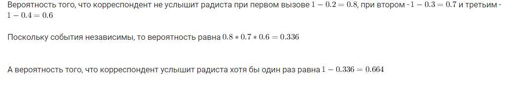 На военных учениях радист трижды вызывает штаб. Вероятность того,что будет принят первый вызов, равна 0,2, второй-0,3, третий-0,4. События, состоящие в том,что данный вызов будет принят,независимы. Найти вероятность того,что штаб услышит вызов.