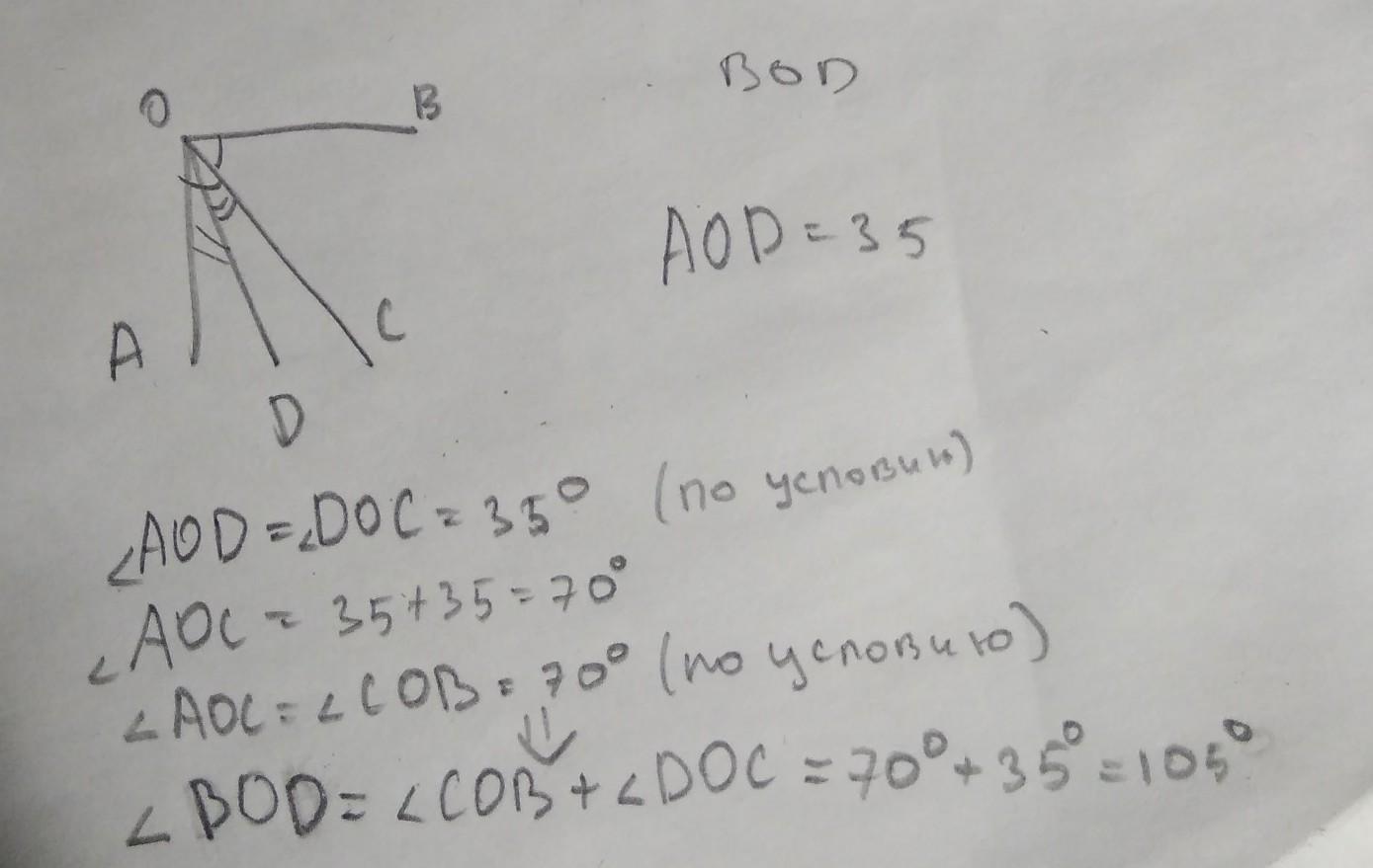 Луч OC - биссектриса Угла AOB. Луч OD - биссектриса угла AOC. Найдите угол BOD, если угол AOD=35°