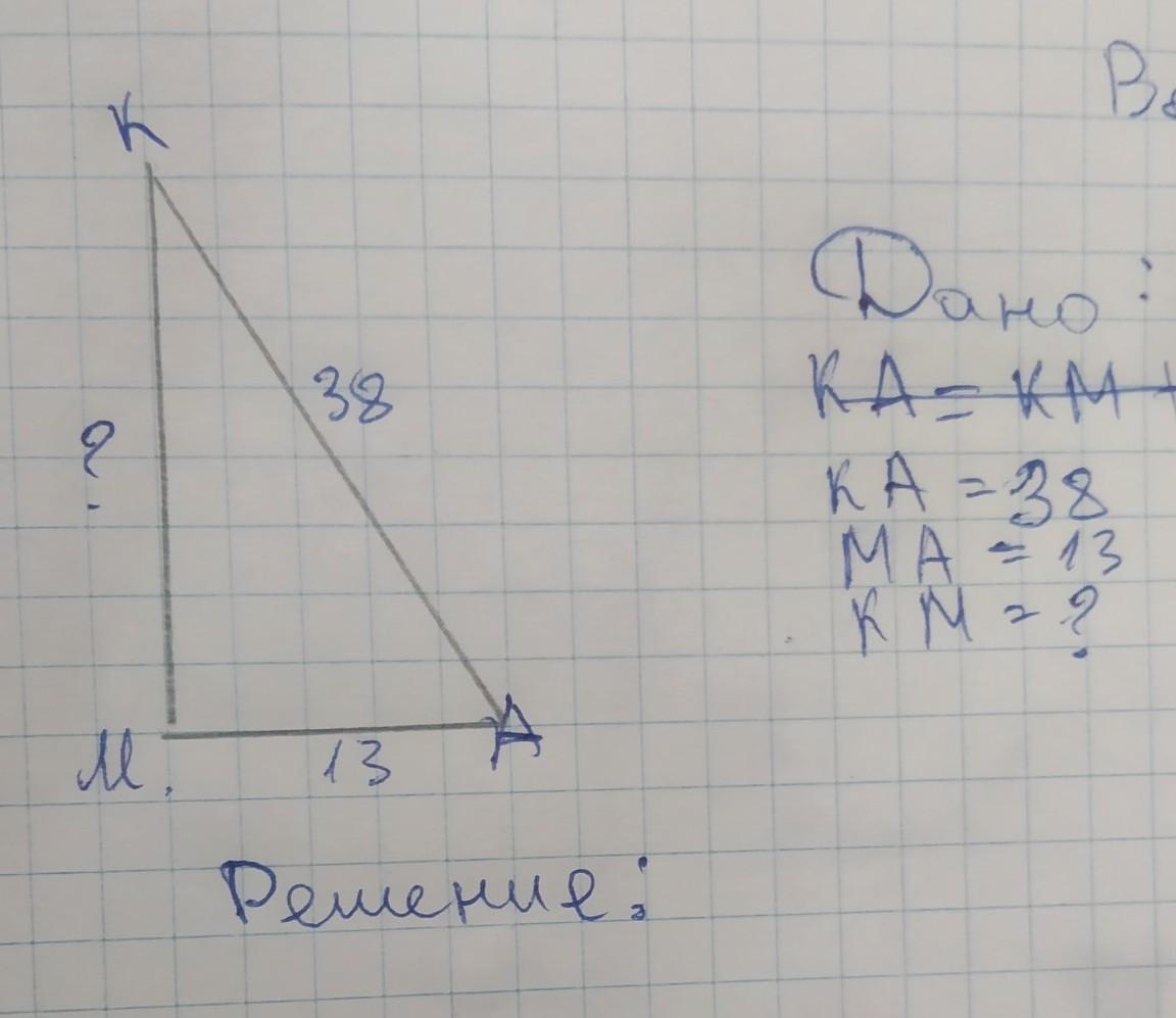 По теореме Пифагора КМ²=38²-13²=1444-169=1275