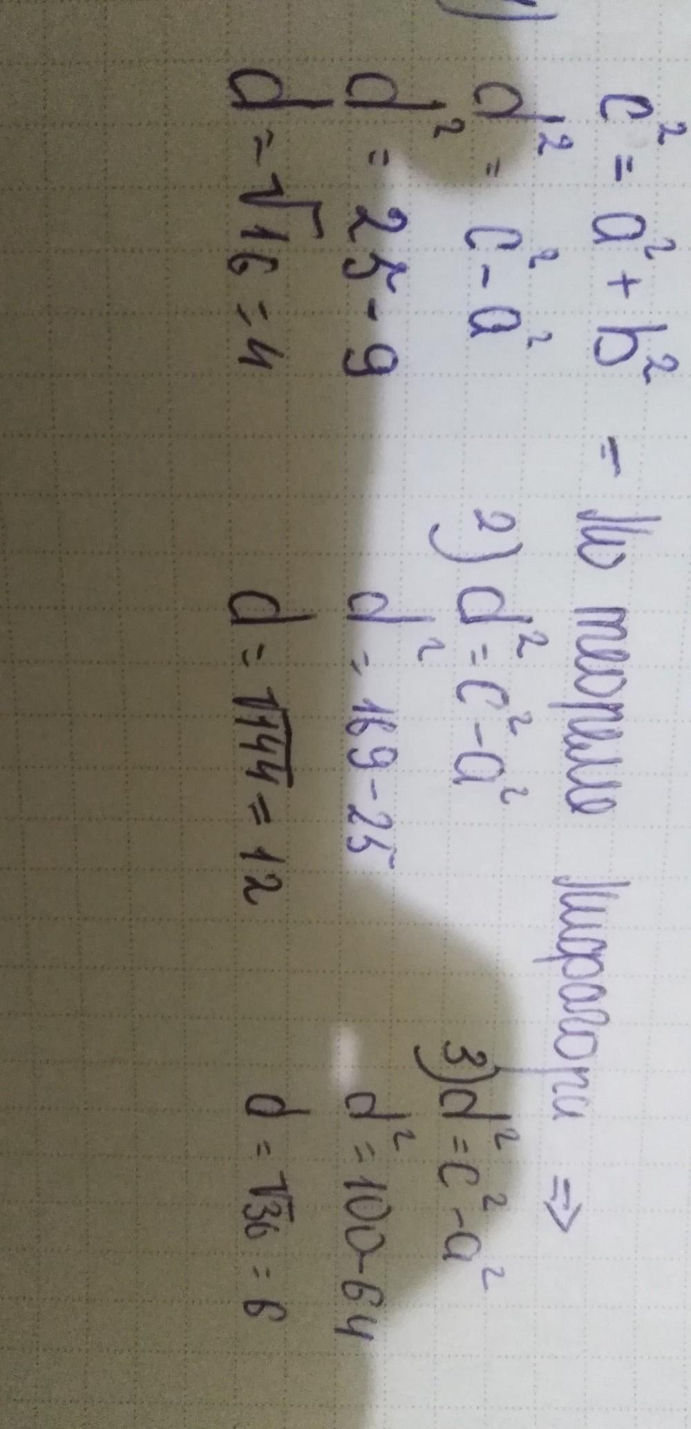 у прямоугольного треугольника заданы гипотенуза c и катет a. найдите второй катет если а)с=5,а=3; б)с=13,а=5; в)с=10,а=8