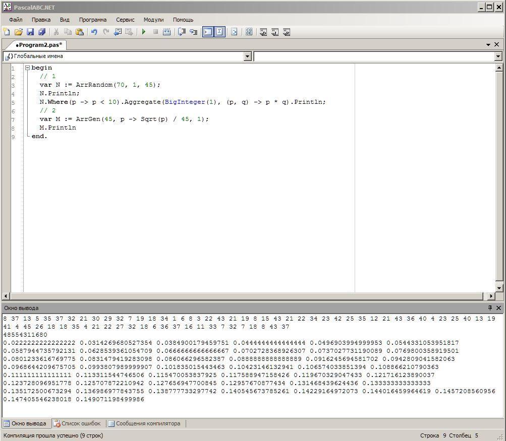1.Заполнить массив N(70) случайнымт цифрами до 45. Найти произведение чисел<10 распечатать массив в строку