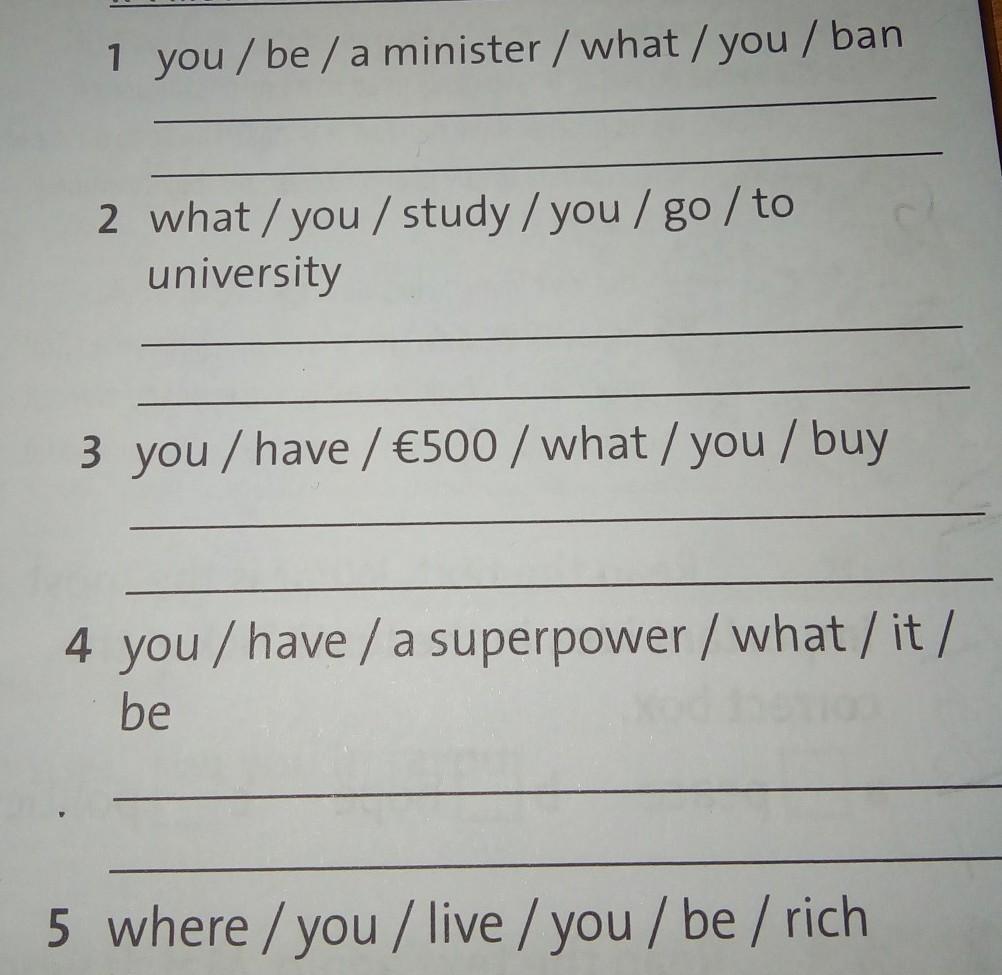 1 If you were a minister, what would you ban? 2 What would you study if you went to university? 3 If you had 500$, what would you buy? 4 If you had a superpower, what would it be? 5 Where would you live if you were rich?