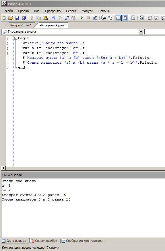$'Квадрат суммы {a} и {b} равен {(Sqr(a + b))}'.Println;