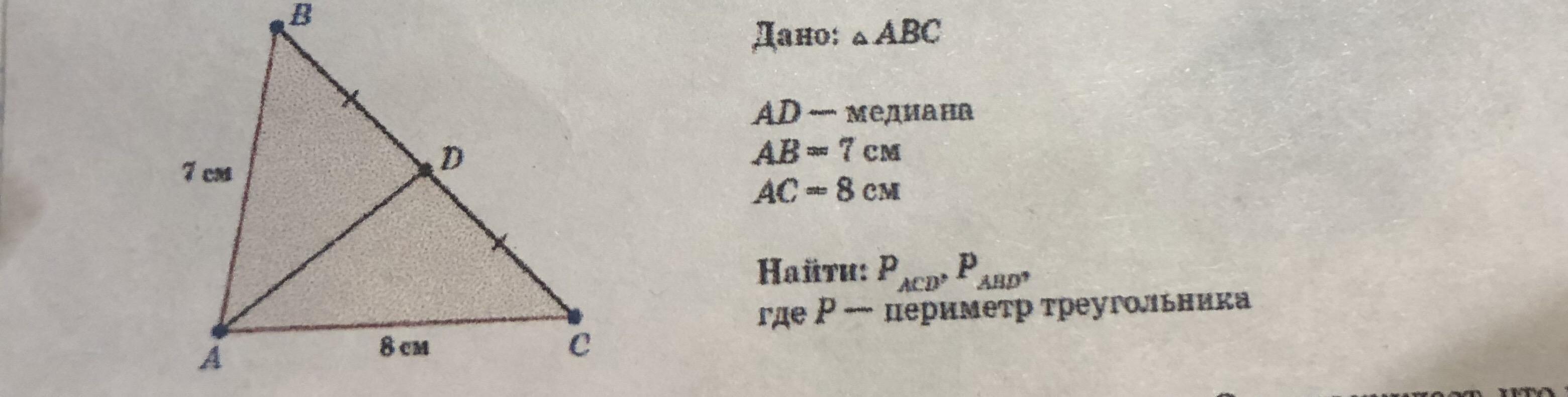 Ответ:тебе нужно измерить длину ВС. Т.к медиана делит треугольник пополам,то тебе нужно разделить ВС и потом сложить стороны что бы найти периметр