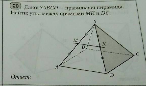из рисунка видим,что МК-средняя линия треуг. SAD.тогда МК||АД. СД перпендикулярно АД,а значит, и МК,то есть искомый угол 90°.