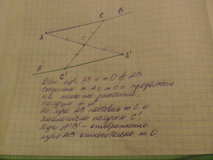Даны луч AB и не принадлежащая ему точка O. Постройте фигуру, на которую отображается этот луч при центральной симметрии относительно точки O