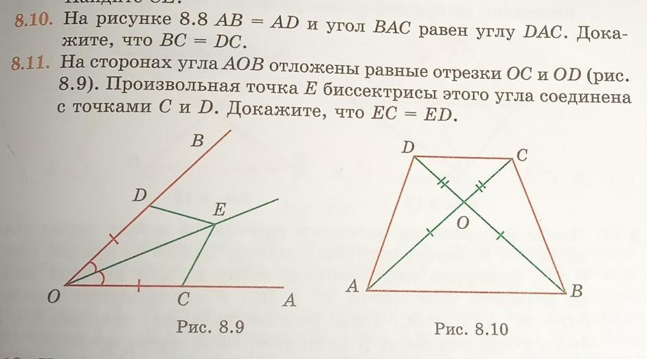 8.11) <DOE=<EOC(т.к ОЕ -биссектриса угла), OD=OC( по усл.), ОЕ-общая, значит тр-ки равны по 1-му признаку, рис 8.8 не видно, к сожалению