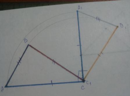 Объяснение:.Повернем сначала отрезки сторон, имеющих общее начало а вершине С. Для этого строим две окружности, с помощью транспортира (или треугольника) отмеряем угол в 90° и соединяемых С с А1 и С1 с В1. Таким образом, мы повернули угол АСВ на 90° по часовой стрелке.