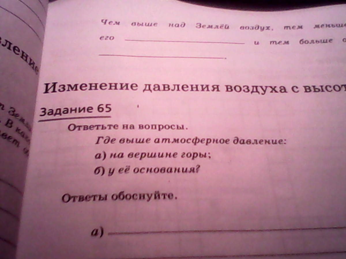 Атмосферное давление определяется весом воздушного столба, который давит на единицу поверхности. Чем вы выше, тем меньше толщина столба, тем меньше он весит. Значитдавление внизу больше, чем наверху.(С)