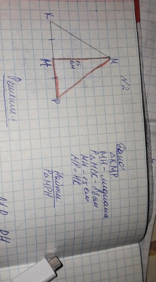 Периметр ΔМРН = МР+НР+МН = 58÷2 + 15 = 29+15 = 44 см.
