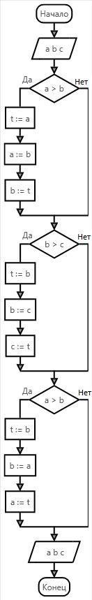 Составьте программу сортировки по возрастанию значений трех переменных: А, В, С. Продемонстрируйте данный алгоритм в виде БЛОК-СХЕМЫ.
