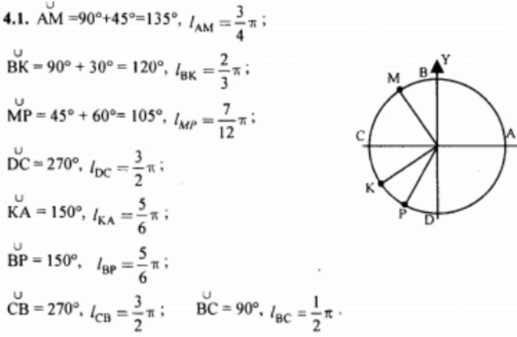 Третья четверть разделена пополам точкой М,а первая четверть разделена на три равные части точками Р, К, Е. Чему равна длина дуги АМ, АК, РЕ,ВК,ВМ,АМ,МР?