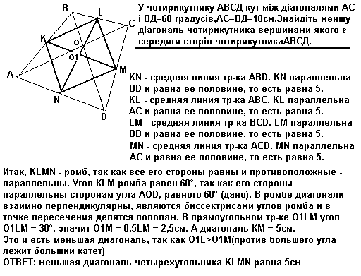 У чотирикутнику АВСД кут між діагоналями АС і ВД=60 градусів,АС=ВД=10см.Знайдіть меншу діагональ чотирикутника вершинами якого є середиги сторін чотирикутникаАВСД.