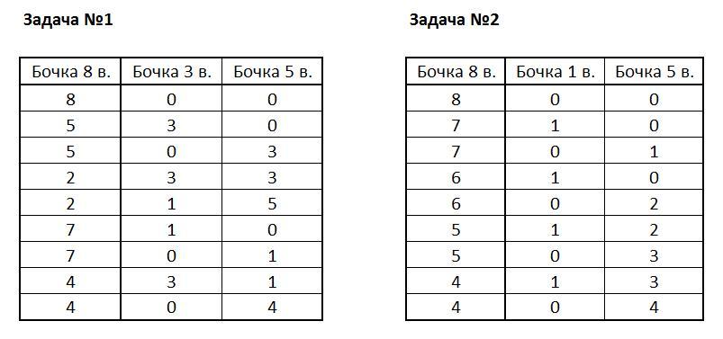 Имеется восьмиведёрная бочка воды. Как отлить из неё ровно половину воды, пользуясь только бочками вместимостью одно и пять вёдер?