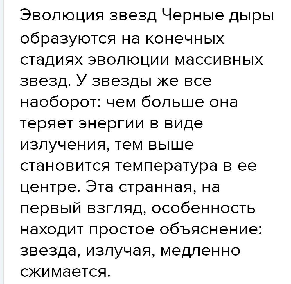 Эволюция звезд Черные дыры образуются на конечных стадиях эволюции массивных звезд. У звезды же все наоборот: чем больше она теряет энергии в виде излучения, тем выше становится температура в ее центре. Эта странная, на первый взгляд, особенность находит простое объяснение: звезда, излучая, медленно сжимается.