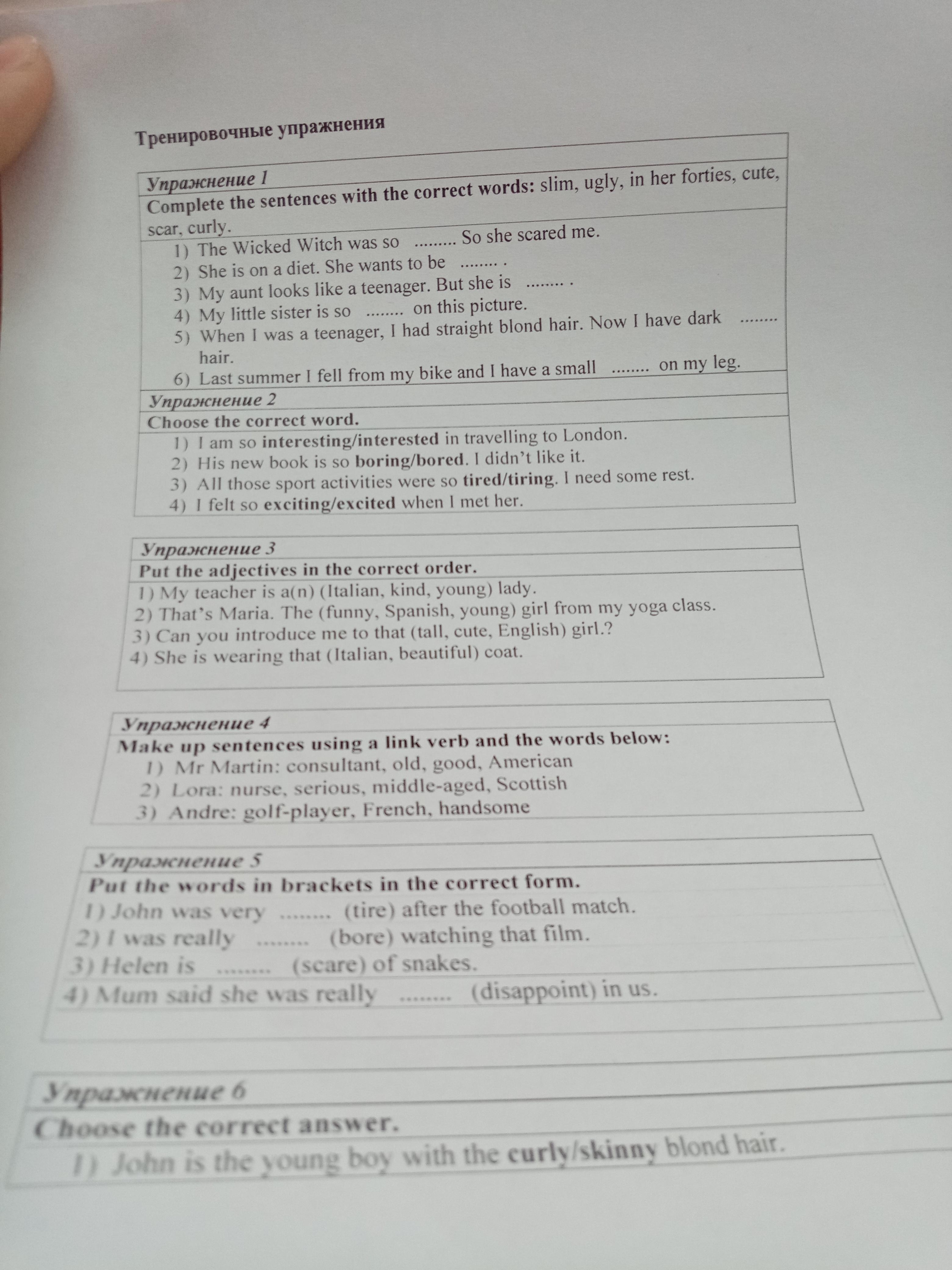 1 1) ugly 2) slim 3)in her forties 4)cute 5) curly 6) scar
