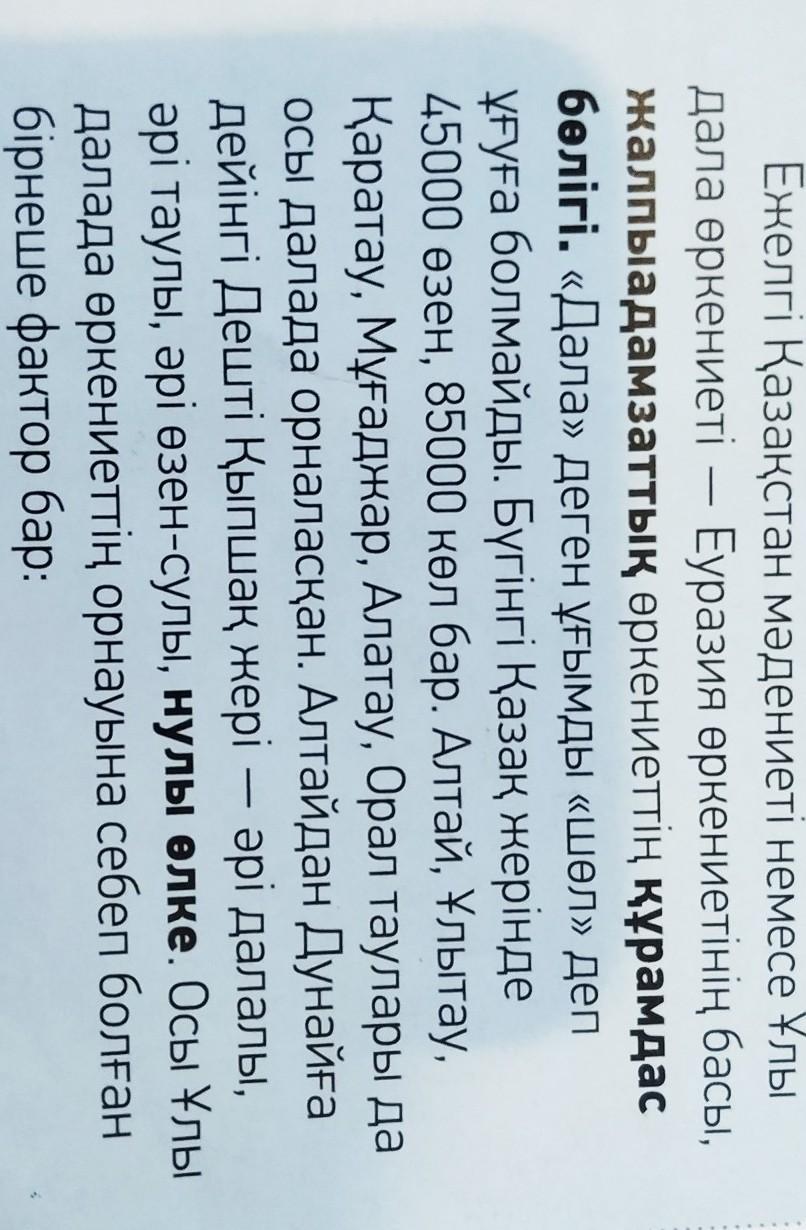 Древняя казахская культура или Великая степная цивилизация - глава евразийской цивилизации неотъемлемая часть универсальных цивилизаций. Термин "степь" нельзя назвать "пустыней". Сегодняшняя казахская земля насчитывает 15 000 рек и 85 000 озер. Алтай, Улытау, Каратау, Мугаджар, Алатау и Уральск также находятся в этой степи. Дашт и Кипчак, от Алтая до Дуная, является апаллитом, ап-равниной и речным водоносным горизонтом. Есть несколько факторов которые привели к становлению цивилизации в этой Великой степи: