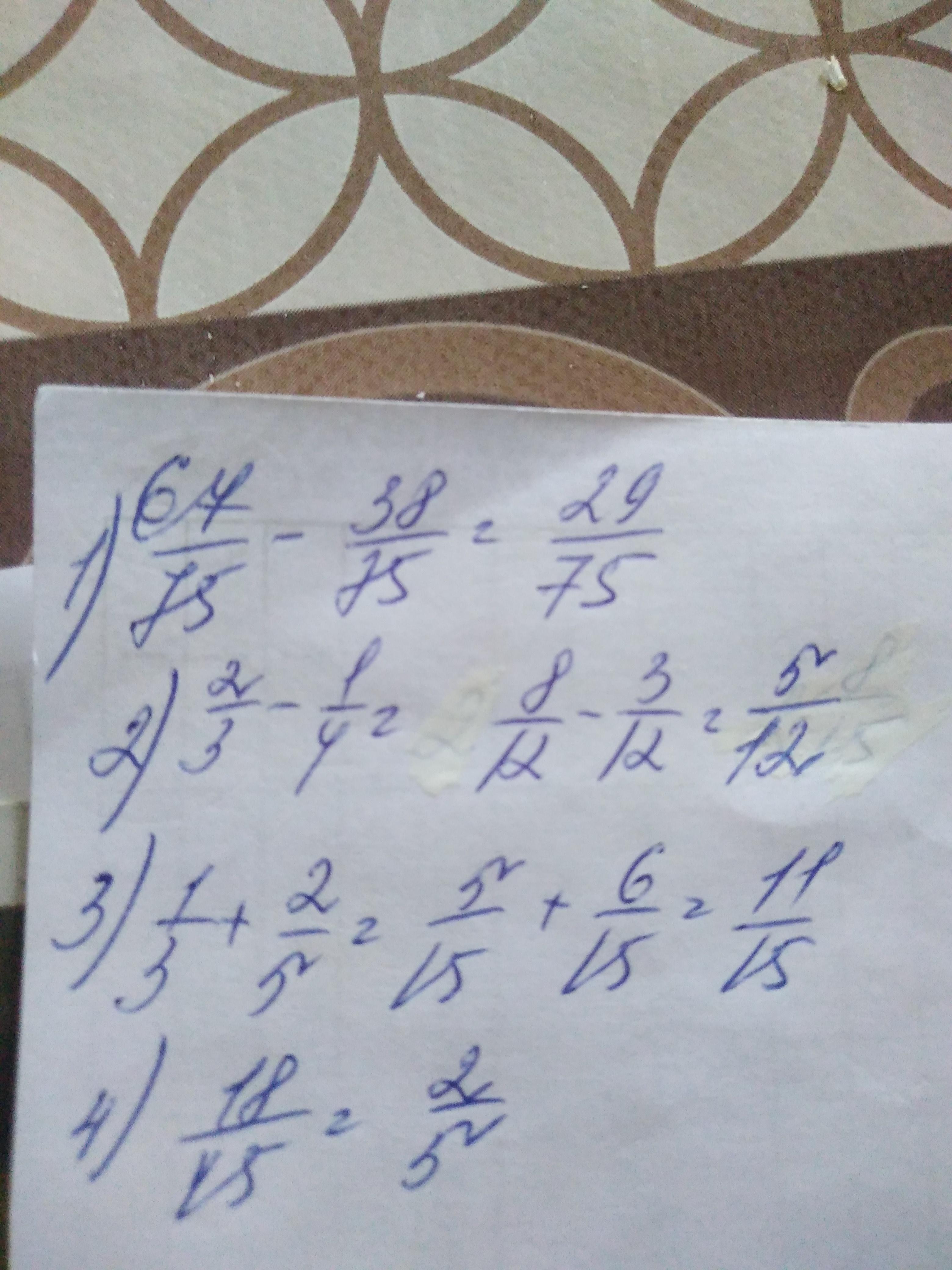 Выполните действие 67/75 - 38/75 = а)28/75 б)29/75 в)27/75 #2 2/3 - 1/4 = а)6/12 б)2/12 в)5/12 #3 1/3+2/5 = а)12/8 б)11/10 в)11/15 #4 Сократите дробь 18/45= а)9/15 б)2/5 в)9/5