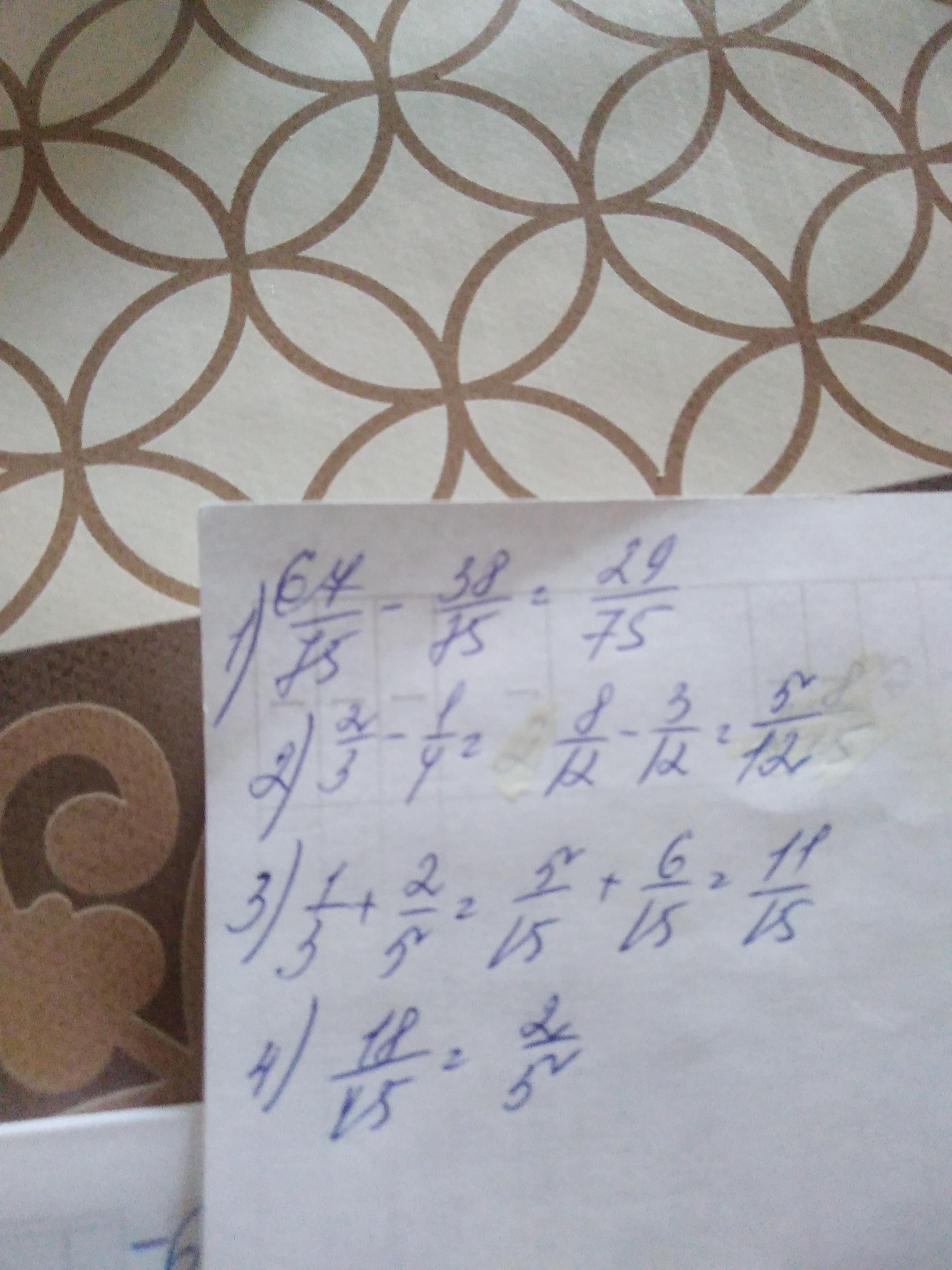 Выполните действие 67/75 - 38/75 = а)28/75 б)29/75 в)27/75 #2 2/3 - 1/4 = а)6/12 б)2/12 в)5/12 #3 1/3+2/5 = а)12/8 б)11/10 в)11/15 #4 Сократите дробь 18/45= а)9/15 б)2/5 в)9/5