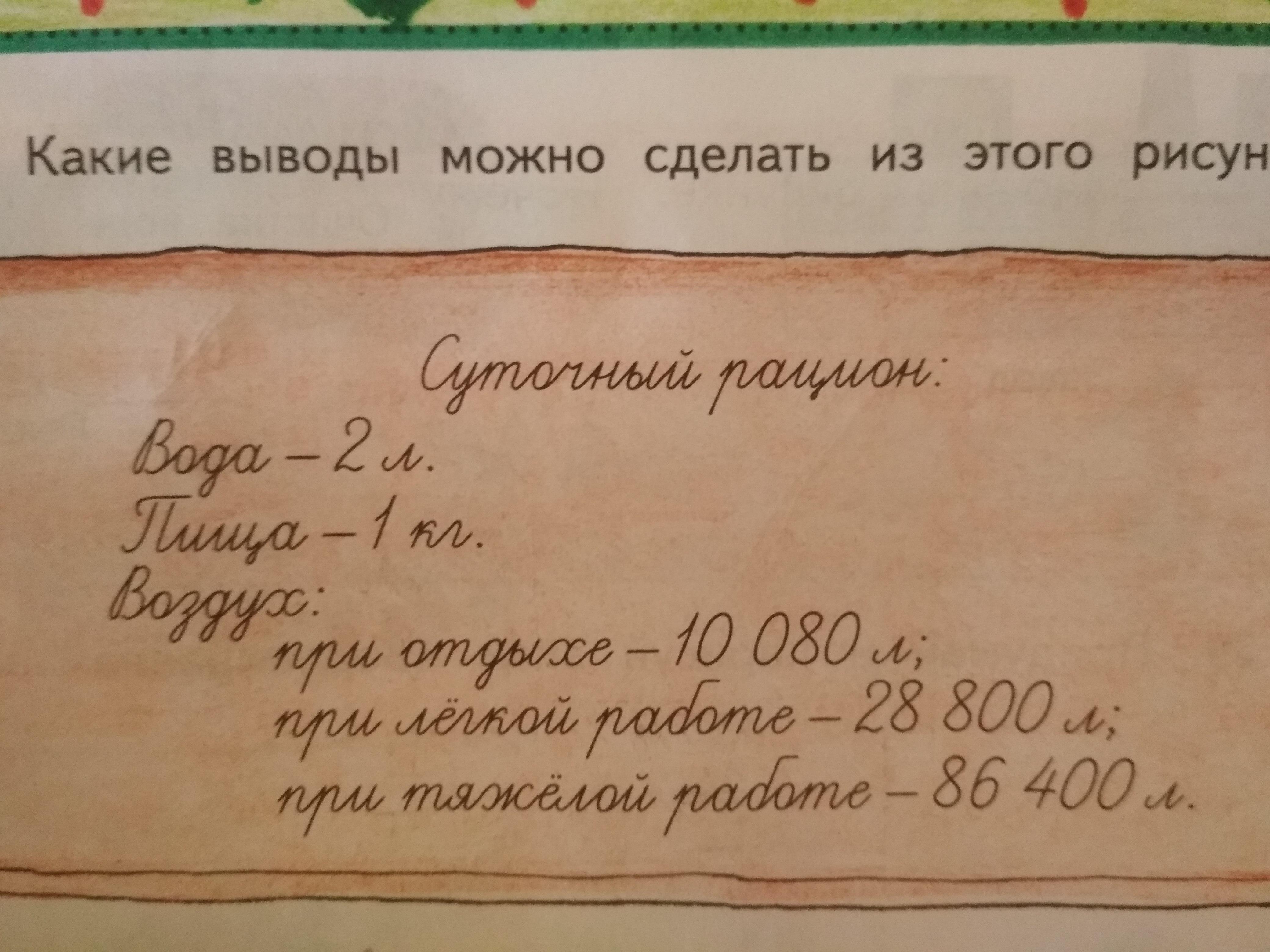 Какие выводы можно сделать из этого рисунка? Вода-2л. Пища-1кг. Воздух: при отдыхе-10.080л; при лёгкой работе-28.800л; при тяжёлой работе- 86.200л.